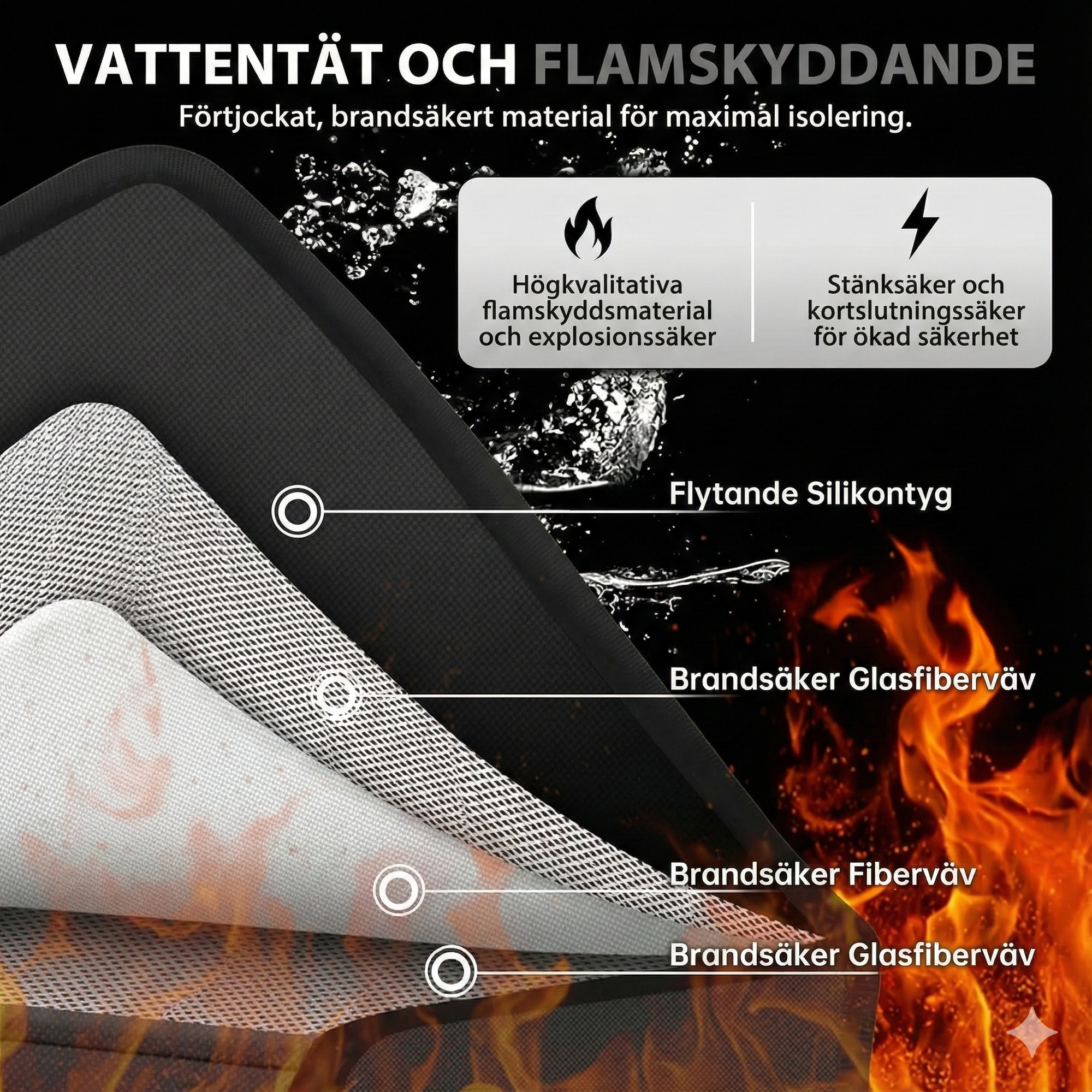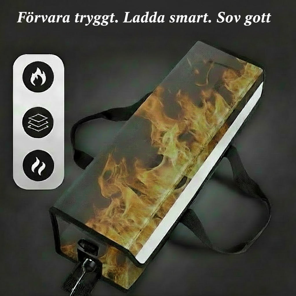 Brandsäker design • Explosionssäker • Säker laddning • Vattentätt skydd • Extra stor kapacitet • Resevänlig • Värmeskyddande material • Sinnesro • Premiumkonstruktion • Åk säkert